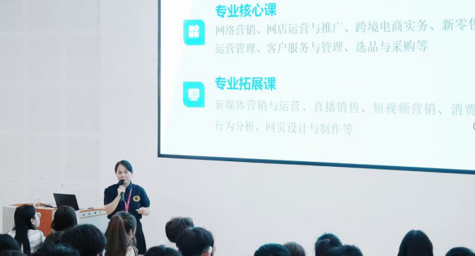作为新生接触专业的“第一课”,此次专业介绍承载着引导学生适应大学学习、建立专业认同感的重要意义。刚步入大学校园的新生,对电子商务的认知多停留在“线上购物”的表层,既不清楚专业与行业的衔接点,也对未来的学习规划、职业选择充满困惑。专职教师以“解决新生‘学什么、怎么学、未来能做什么’的核心疑问”为出发点,用贴近新生认知的语言,将专业轮廓清晰呈现——从“聚焦互联网服务、批发零售领域,培养运营、主播、数据分析师等实战人才”的专业定位,到“基础课筑基、专业核心课强能、专业拓展课拓界”的课程设置逻辑;从“以项目实战为核心”的技能培养与实习实训安排,到“以赛促学、以证赋能”的技能大赛与职业资格证考取建议,再到“校内专升本、海外留学”的多元升学通道,每一项内容都围绕“帮助新生建立清晰成长路径”展开。