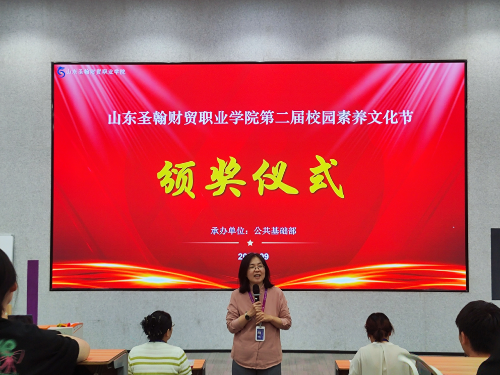 9月29日,公共基础部在学校第四报告厅举行山东圣翰财贸职业学院第二届校园素养文化节颁奖仪式。此次颁奖仪式聚焦师生素养提升成果,全面总结文化节期间各项赛事开展情况,为在系列竞赛中脱颖而出的师生颁发荣誉,进一步激发全校师生对语言文字、数学学科及教学能力提升的热情,营造浓厚的校园文化与学术氛围。公共基础部主任阎君梅、副主任黄海英、各教研室教师及获奖学生共同参与仪式,见证师生们在素养提升之路上的亮眼成绩。