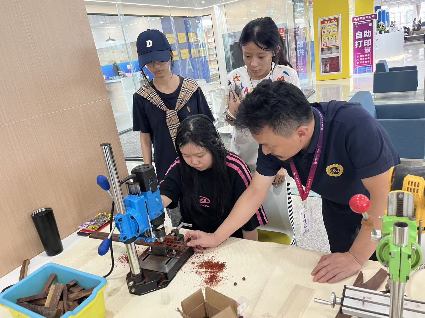 在非遗传承人郑老师的指导下,新生们亲手体验操作佛珠刀,做小叶紫檀手串的传统技艺。郑老师通过讲解发展史、演示制作工艺,引导学生做小叶紫檀手串作品。学生们在小叶紫檀佛珠的过程中,深刻理解了传统工艺中“人化自然”的哲学思想。2025级会计专业新生感慨:“一块木板经过精准切割,竟能完美的呈现造型,这让我明白商业创新需要敬畏传统、精研细节。”