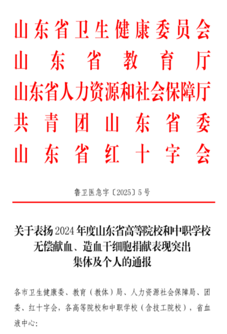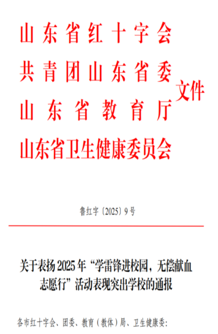 山东圣翰财贸职业学院凭借出色的组织工作,荣获2024年度山东省无偿献血组织表现突出学校称号,同时还荣获2025年“学雷锋进校园,无偿献血志愿行”表现突出学校称号。
