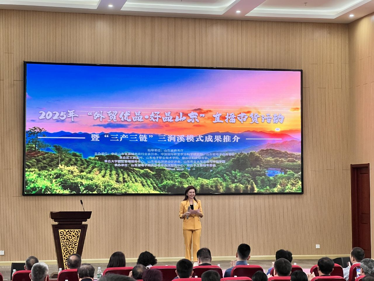 本次活动围绕“庆丰收·迎双节·促融合·赋新能”核心目标展开,设置领导致辞、“三产三链”三涧溪模式推介与成果展示、云仓服务体系及电商大数据平台发布、项目签约与颁奖、主题研讨、全天候直播带货、产品展示与资源对接等七大环节。现场,三涧溪村高淑贞书记围绕“党建引领乡村振兴”主题发表讲话,总结分享三涧溪村依托“三产三链”模式推动乡村产业转型升级的实践经验。山东省电子商务协会秘书长于登杰详细解读了党建引领下“三产三链”模式,深入剖析该模式在促进和助力农业数字化转型中的核心作用与价值。同时,多项赋能乡村电商发展的成果集中落地,例如山东省云仓服务体系、电子商务大数据平台正式发布,为农产品溯源、物流配送提供数字化支撑。此外,项目签约与颁奖、主题研讨、全天候直播带货、产品展示与资源对接等环节有序推进,不仅见证了一批乡村电商合作项目落地,更通过直播带货将山东外贸优品推向全国市场,同时搭建起政企校多方资源对接的桥梁。