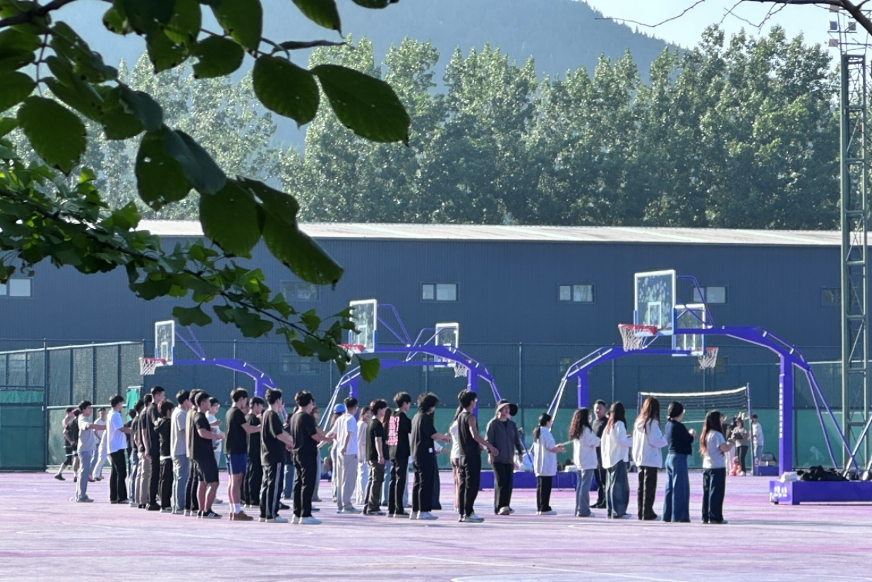 而在一旁的篮球场上,另一番景象同样精彩。同学们或排队等候参与训练项目,或在教练的指导下进行着篮球基础技能练习。篮球架矗立在场地两侧,紫色的场地在阳光下格外亮眼。大家专注地聆听教练讲解动作要领,眼神中充满了对篮球运动的好奇与向往。从基本的运球、传球,到尝试投篮,每一个动作都认真对待,篮球在他们手中传递,也传递着运动的快乐与团队协作的精神。