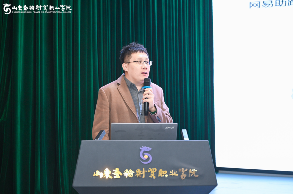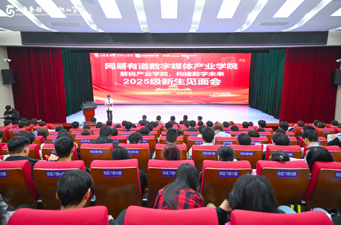 为帮助新生快速了解学院办学理念、培养模式与发展方向,搭建新生与校企双方沟通的桥梁,开启新生专业学习与职业规划的全新旅程。2025年10月17日,山东圣翰财贸职业学院云商传媒学院联合网易有道信息技术(北京)有限公司,在吉纯楼第二报告厅成功举办“解码产业学院,构建数字未来”新生见面会暨数字媒体技术专业介绍活动。网易有道产教融合事业部教研总监王辉、华北大区总经理赵洪祥、学业就业规划部薛聪聪,山东圣翰财贸职业学院云商传媒学院院长李学治、学生管理副院长孙建国、数字媒体技术教研室全体教师及2025级数字媒体技术专业学生参加了活动。