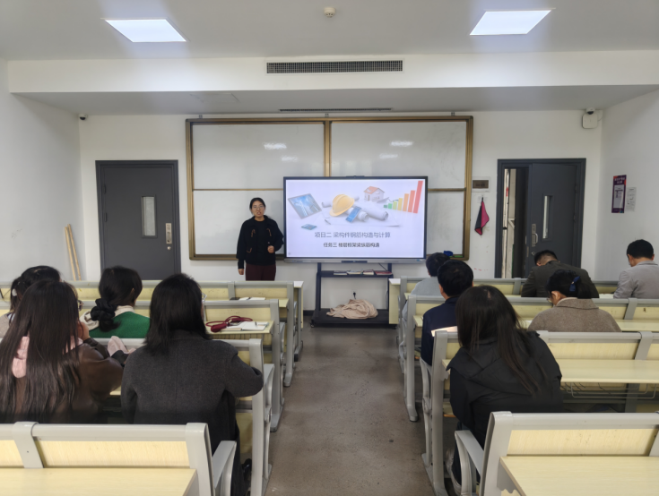 会议伊始,张贺老师结合青教赛评分标准,现场展示《平法识图》课程的教学片段,从教学目标设定、教学内容设计、教学方法运用等方面进行详细讲解,重点呈现了 “图纸解析 + 案例实操” 的教学思路。随后,参会教师围绕教学环节展开点评,针对课程难点 “钢筋排布规则讲解”“识图与施工结合” 等提出优化建议,如增加建筑工程真实案例、借助BIM模型实现三维可视化教学等。