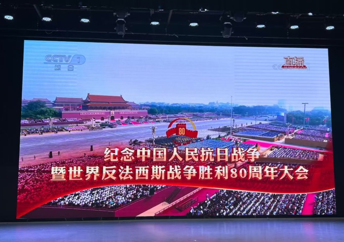为铭记历史、传承伟大精神,2025年9月3日,学校组织全体教职工在第二报告厅观看纪念中国人民抗日战争暨世界反法西斯战争胜利80周年阅兵活动直播,资产管理中心人员积极参加。